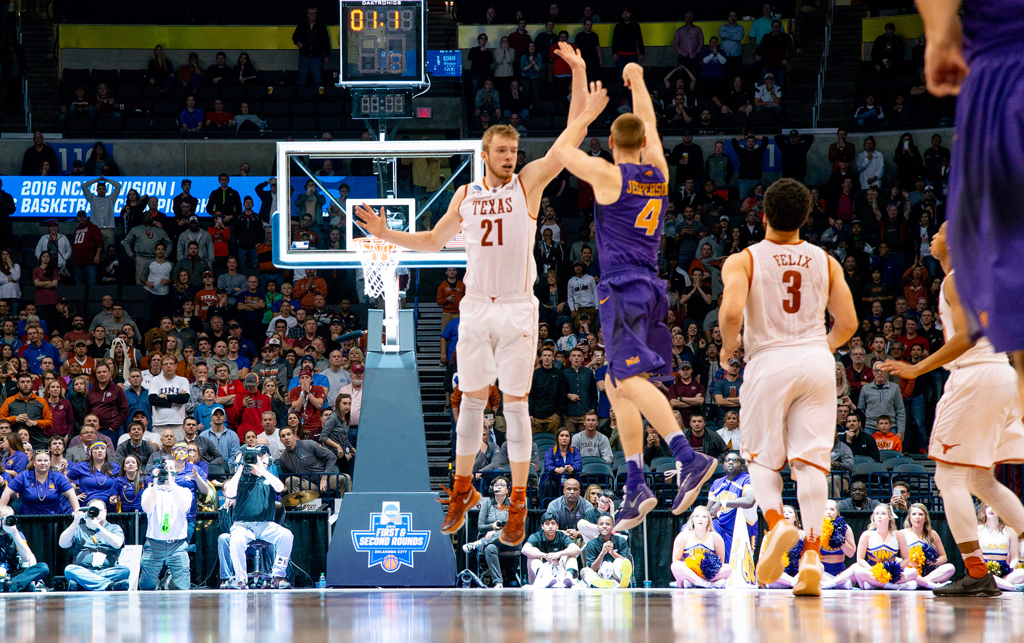 No. 11 Northern Iowa clung to a 72–70 lead late in regulation against No. 6 Texas in the first round of the 2016 Midwest Regional. With fewer than 12 seconds to play, Texas guard Isaiah Taylor drove the lane and got a layup to go that tied the contest at 72 with fewer than three seconds remaining. Northern Iowa inbounded the ball to Paul Jesperson on the right sideline, who crossed over to the middle of the floor and put up a half-court heave as time expired. Cash. The Panthers advanced to the round of 32 in an absolute stunner.